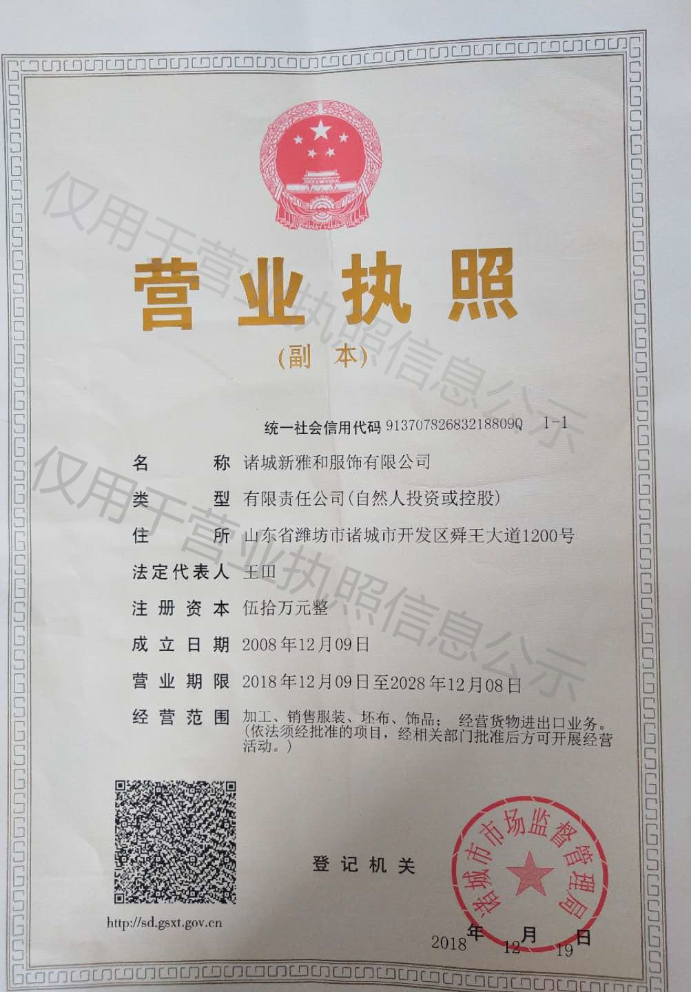 諸城新雅和服飾有限公司是一家擁有自營進(jìn)出口權(quán)、集貿(mào)工一體的現(xiàn)代化針織服裝加工出口企業(yè)。公司座落在諸城開發(fā)區(qū)橫四路北206國道以東。公司現(xiàn)有現(xiàn)代化日本進(jìn)口電腦縫制設(shè)備200多臺套,職工300人,年出口創(chuàng)匯1000萬美元。公司擁有一個團結(jié)務(wù)實、業(yè)務(wù)嫻熟、反應(yīng)迅速、年輕化、現(xiàn)代化的管理團隊。